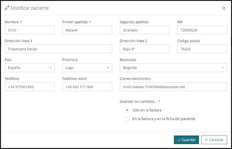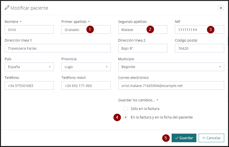 - Indicar (4) si quieres cambiar los datos solo en la factura o también en la ficha del paciente.