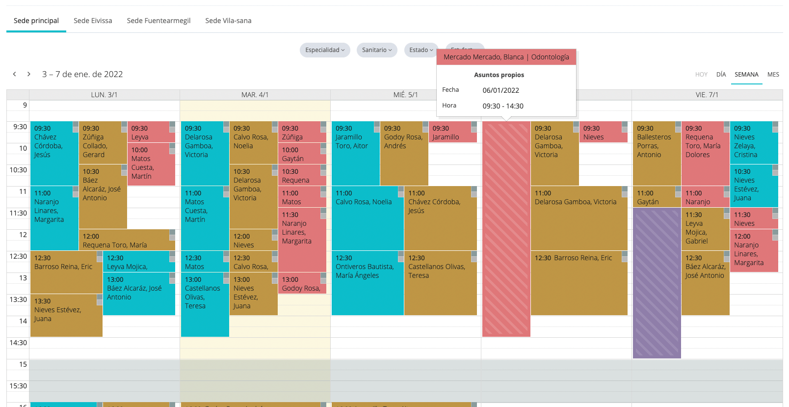 Además, te aparecerán con fondo rallado los días o intervalos de horas en los que los empleados no están disponibles. En la siguiente imagen puedes ver que el jueves 6 de enero «Blanca Mercado Mercado» no está disponible de 9:30 a 14:30 por «Asuntos propios».