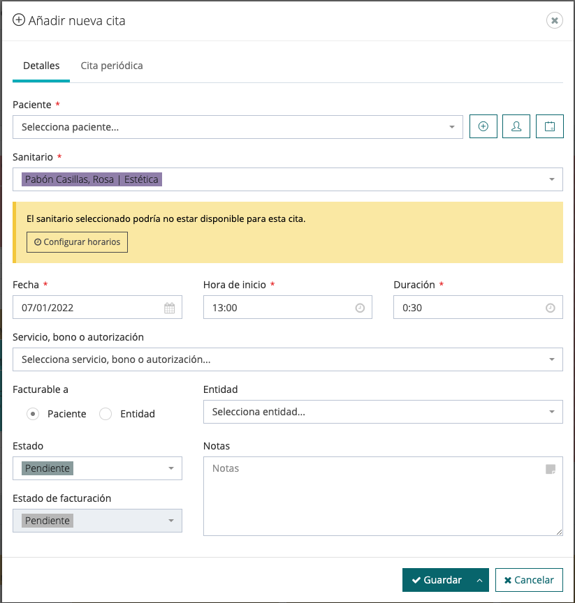 Si tratas de dar una cita fuera del horario de trabajo del empleado, te aparecerá un mensaje de alerta indicando que «El sanitario seleccionado podría no estar disponible para esta cita». La aplicación te permite crear la cita, pero te avisa del problema.