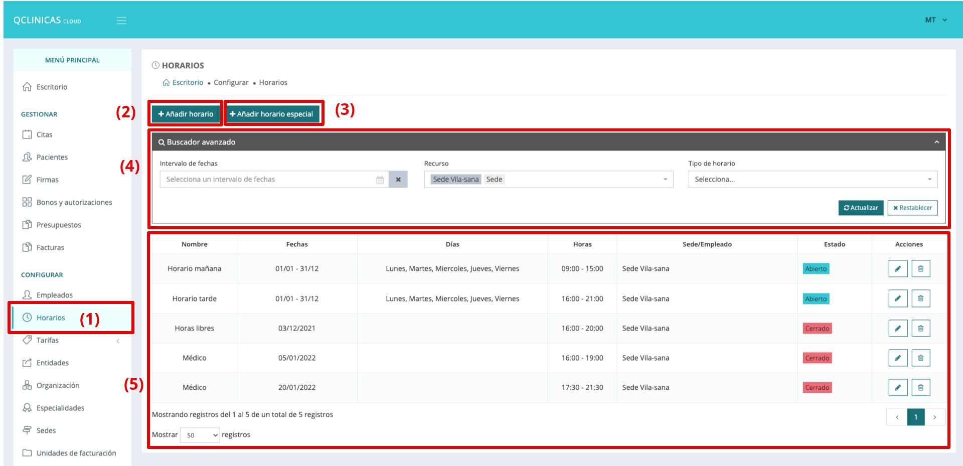 - Filtrar los horarios existentes por: intervalo de fechas, recurso (sede o empleado) y tipo de horario.