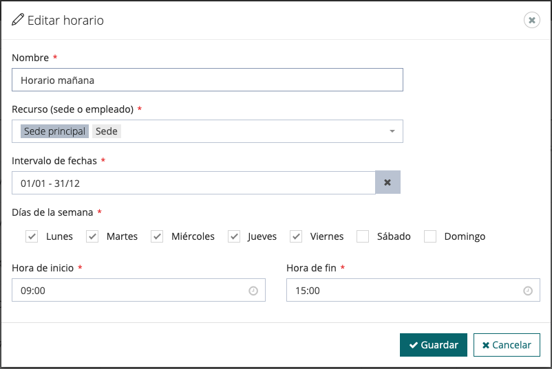 En el siguiente ejemplo, cuyo nombre es «Horario mañana», estamos indicando que la «Sede principal» está abierta desde el 1 de enero hasta el 31 de diciembre, de lunes a viernes, de 9:00 a 15 horas.