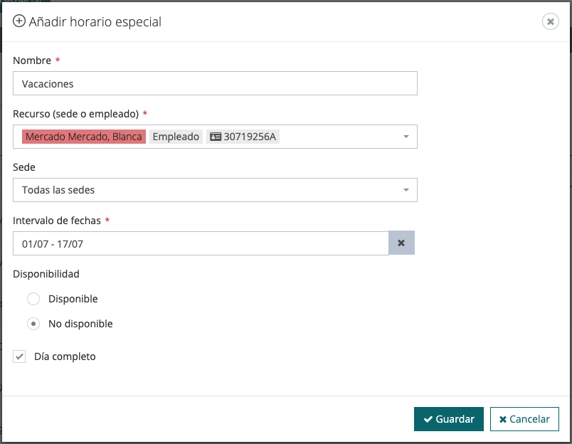 Con los horarios especiales puedes gestionar los horarios de los recursos (sedes y empleados) que no se correspondan con los horarios habituales de tu clínica. Gracias a esta funcionalidad puedes gestionar vacaciones, días libres, horas en las que un empleado no puede trabajar (asistencia a una consulta médica, reunión en el colegio de sus hijos,…), pero también horarios de especial apertura, como puede ser que un empleado trabaje fuera del horario habitual determinados días concretos.