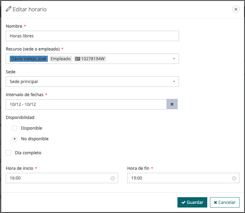 En el siguiente ejemplo, el empleado «José Dávila Vallejo» no está disponible desde las 16:00 hasta las 19:00 horas del día 10 de diciembre del año actual.