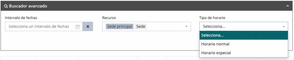 Tras añadir los horarios de tus sedes y de tus empleados, puedes filtrarlos usando el buscador avanzado. Podrás filtrar tus horarios por: