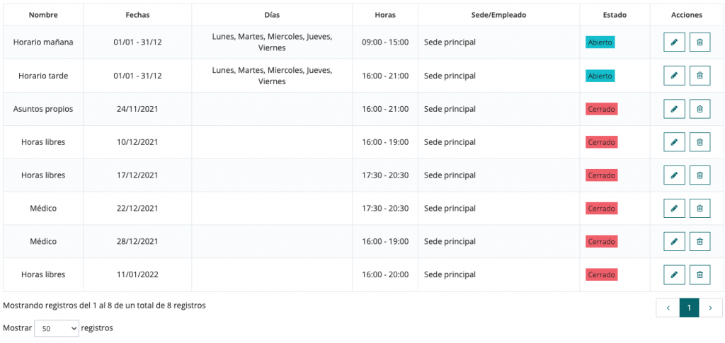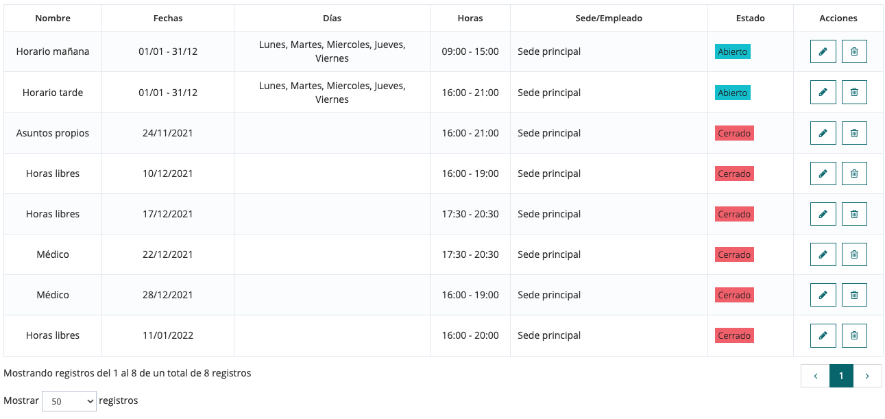 Justo debajo del filtro de horarios tienes disponible los horarios que coinciden con el filtro. Ahí podrás ver sus características principales y también editarlos y borrarlos.