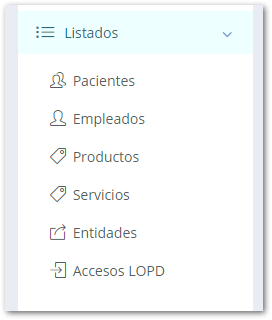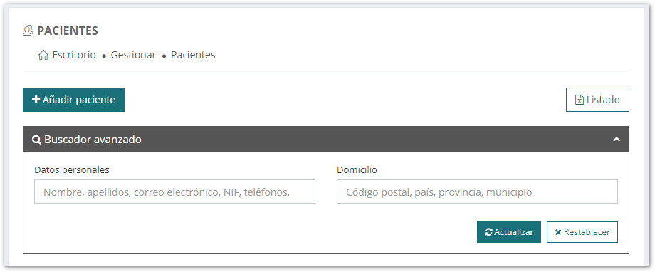 - Datos personales, donde puedes buscar un paciente concreto por nombre, apellidos, correo electrónico, NIF o teléfono.