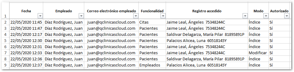 El listado de accesos LOPD creado tiene el siguiente formato: