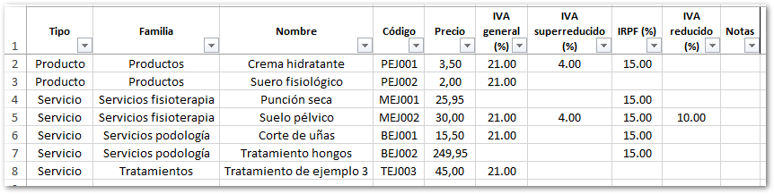 El listado de tarifas creado tiene el siguiente formato: