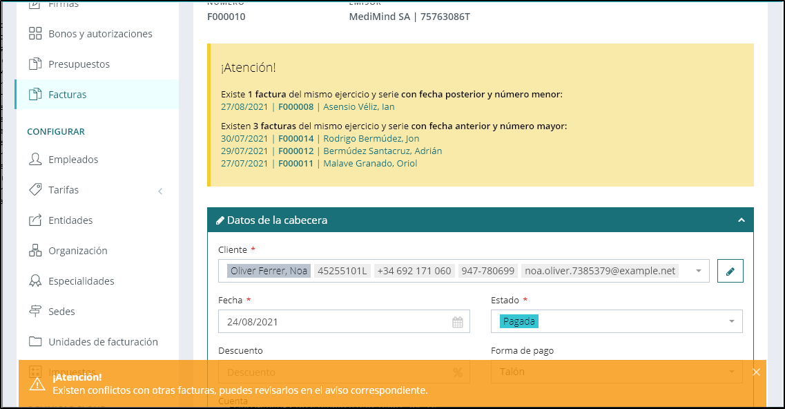 • En la parte superior verás un aviso permanente, donde te muestra los conflictos de esta factura con las del resto de la serie.