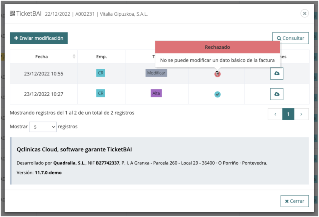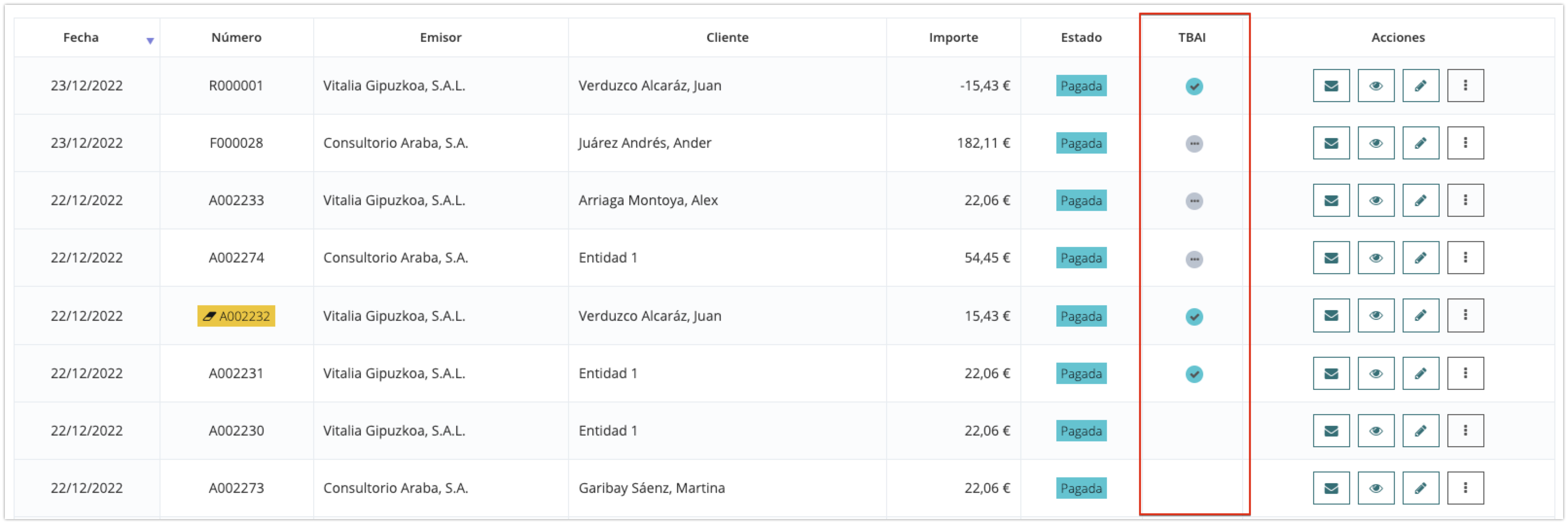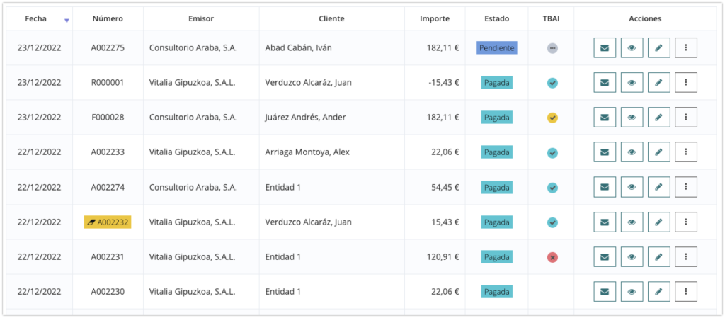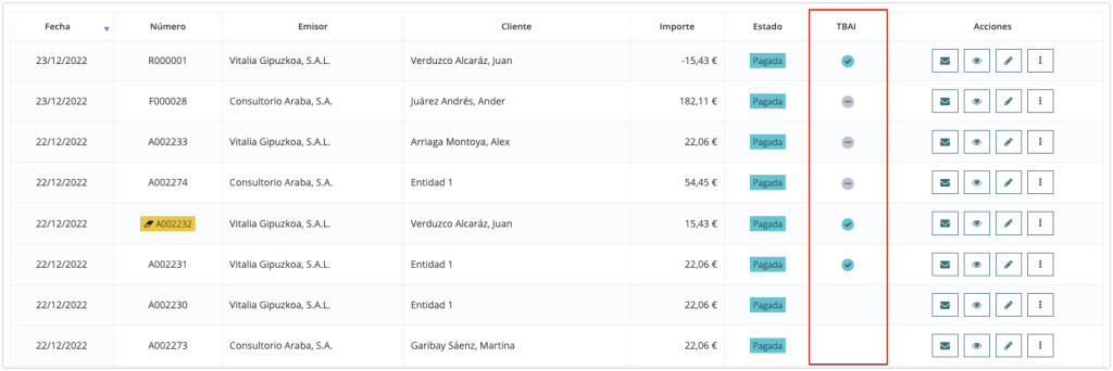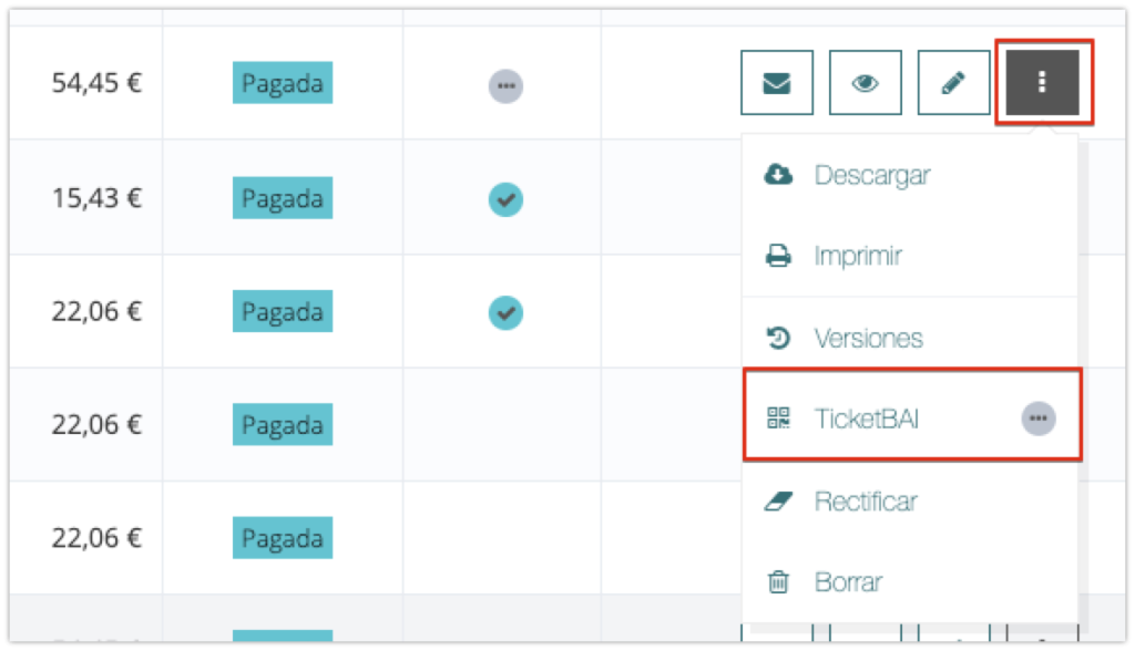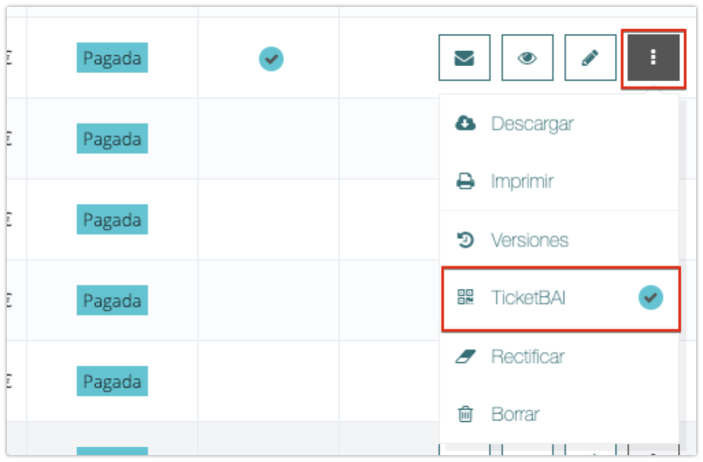 - Icono verde: factura notificada a TicketBAI.
