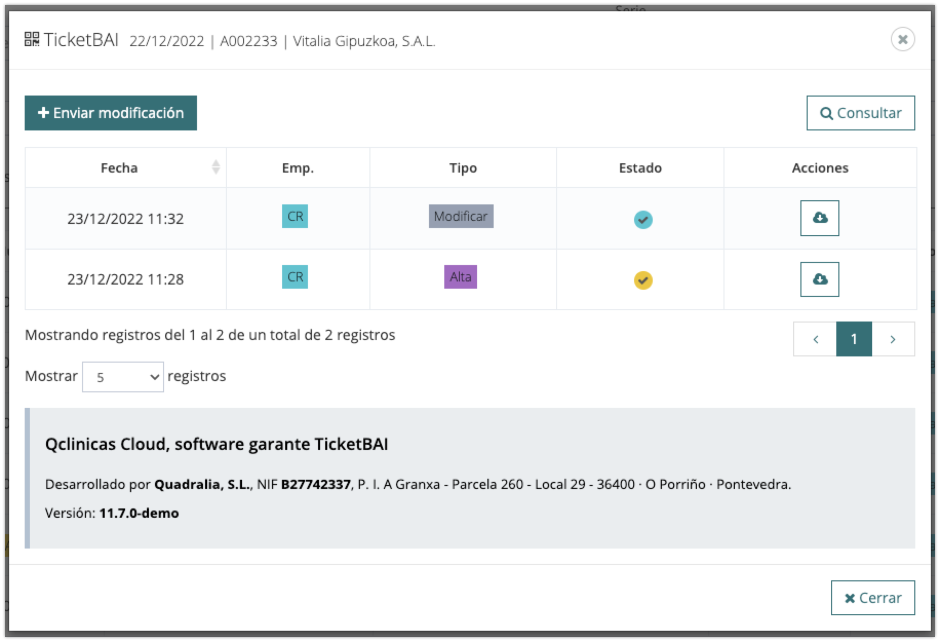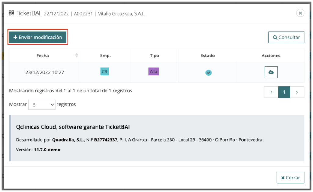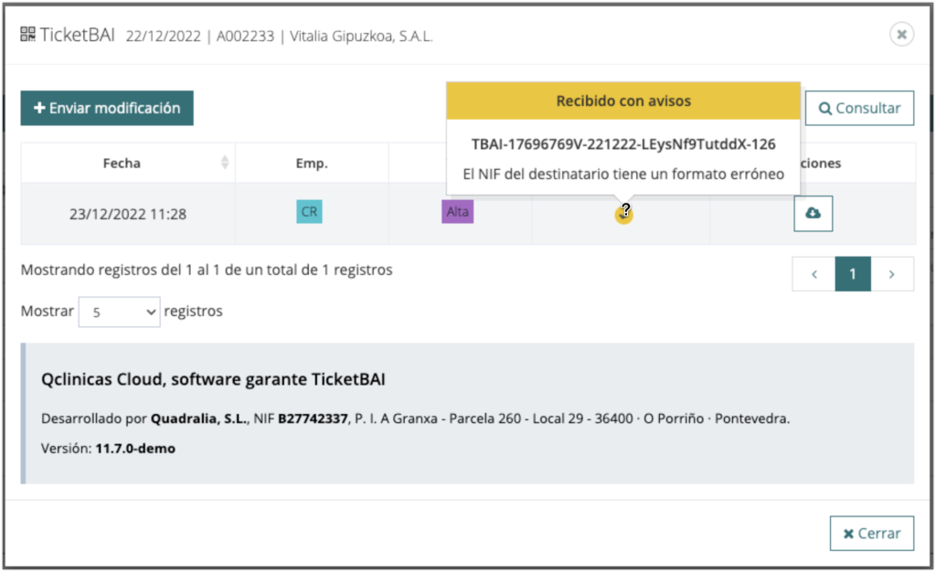 - Icono gris: pendiente de notificar a TicketBAI.