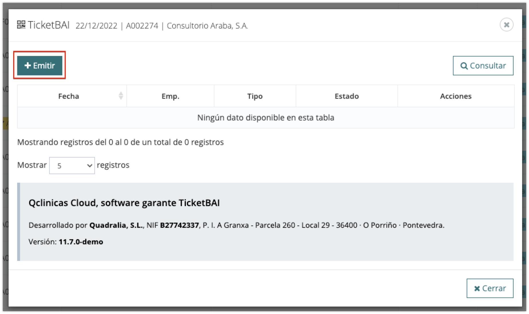 Se abrirá una ventana emergente, en la que tendrás que hacer clic en el botón «Emitir» para notificar la factura a TicketBAI.