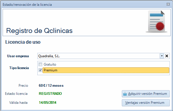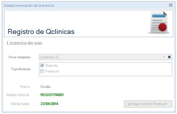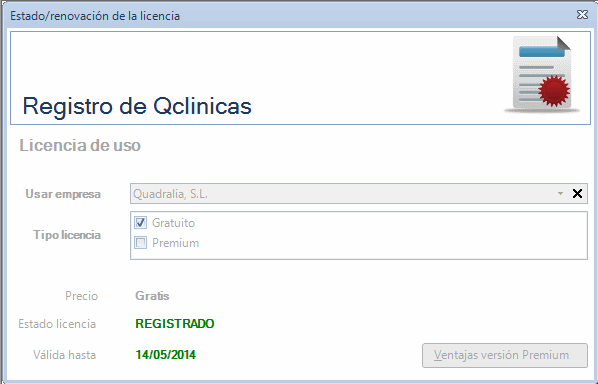 Aparecerá una nueva ventana en la que se muestra el registro actual de Qclinicas. En este caso está registrada la licencia Gratuita.