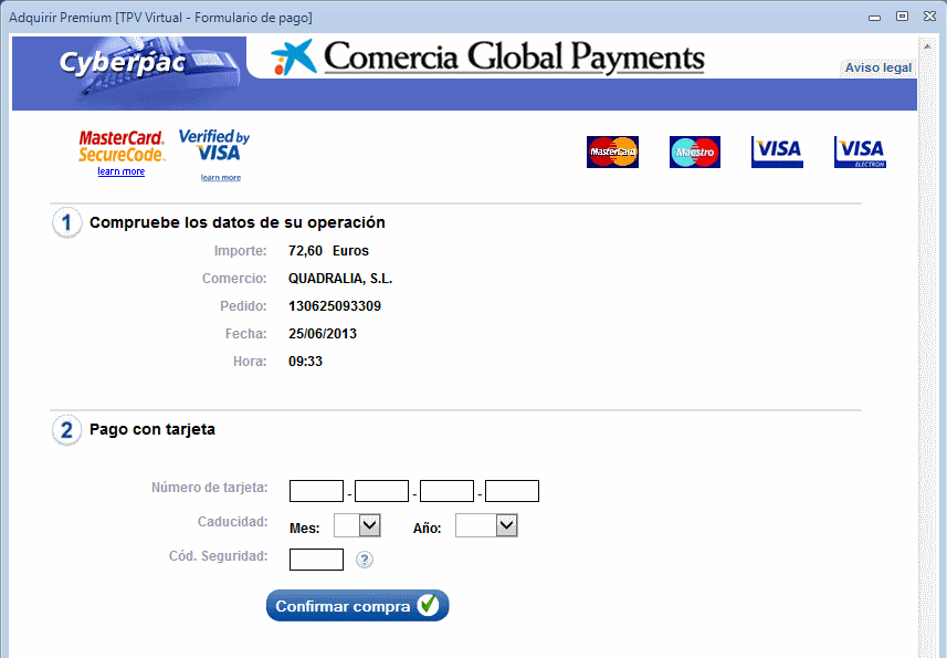 Luego hay que hacer clic en el botón «Adquirir versión Premium», que abrirá una nueva ventana que te llevará a la pasarela de pago del banco para que puedas introducir los datos de tu tarjeta (método seguro) y finalizar la compra de Qclinicas Premium.